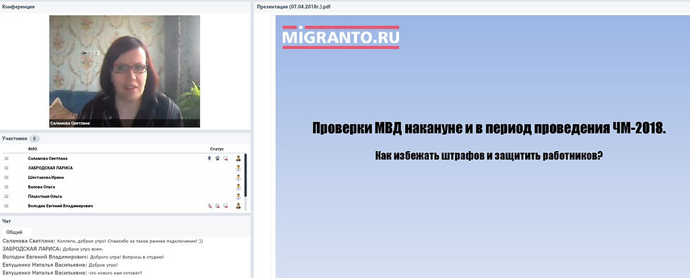 В субботу 07 апреля портал Migranto.ru провел очередной вебинар для организаций на тему: «Проверки МВД накануне и в период проведения ЧМ-2018. Как избежать штрафов и защитить работников?».